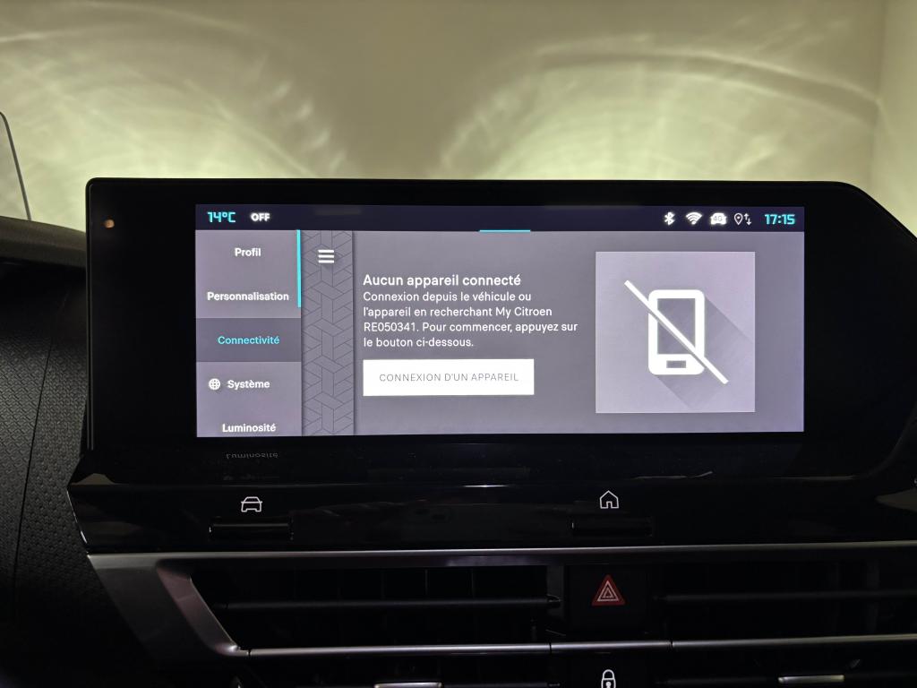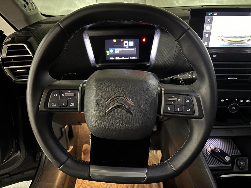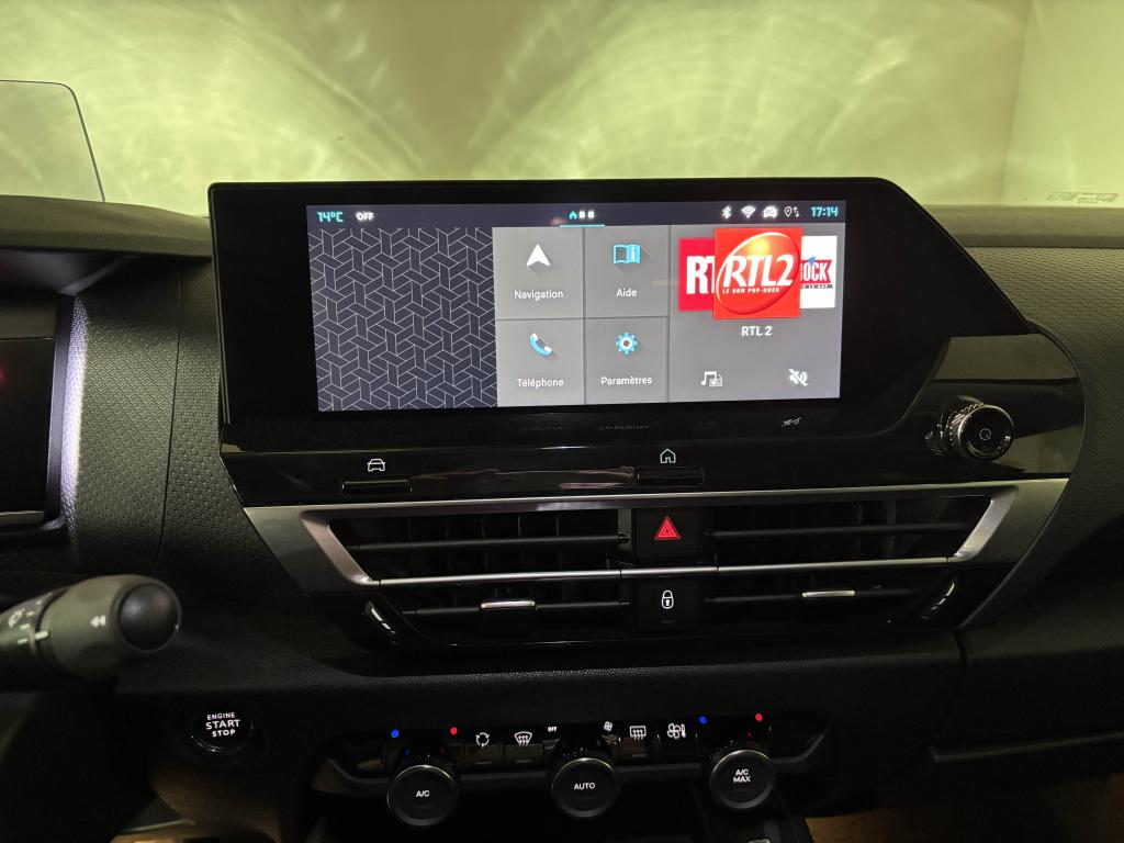 ABS avec répartiteur électronique de freinage (REF) et aide au freinage d'urgence (AFU)Aérateurs centraux pour les passagers arrièreAffichage tête haute couleurAide au démarrage en côteAide au stationnement arrièreAirbags frontaux, latéraux avant et rideauxAllumage automatique des projecteursAmbiance Métropolitan GreyAntibrouillards avant à LED avec éclairage d'intersectionApple CarPlay et Android Auto (les deux sans fil)Banquette arrière fractionnable 2/3 - 1/3Boîtier télématique : Appel d’urgence et Citroën AssistanceBoitiers de rétroviseurs extérieurs noir brillantClignotants impulsionnelsClimatisation automatique bi-zoneCommandes audio au volantCondamnation centralisée des portes par plip et condamnation automatique des portes en roulantConsole centrale haute avec accoudoir et rangement intégréContrôle dynamique de stabilité (ESP)Désactivation manuelle airbag passager AVDétection de sous-gonflage des pneumatiquesDirection à assistance électrique variableEclairage de bienvenue et d'accompagnementEclairage plafonnier avant et arrièreEcran central 10" avec technologie tactileElargisseurs d'ailes et bas de caisse noir matEssuie-glace à déclenchement automatiqueFeux diurnes à LEDFixations ISOFIX sur sièges latéraux arrièreFrein de stationnement électrique automatiqueJantes alliage 18'' AEROBLADE DiamantéesJupe arrière en Noir BrillantKit de dépannage provisoire de pneumatiquesKit mains libres BluetoothLève-vitres avant et arrière (rang 2) électriques et séquentielsPack Access & NavPack Color SilverPack Drive AssistPack SafetyPack Safety 2Pack StylePalettes de changement de rapports au volantPare-soleil avec miroir de courtoisie occultable côtés conducteur et passagerPeinture nacrée Noir Perla NeraPoignées de portes extérieures couleur caissePrise 12V à l'avantPrise USB-A en rang 1Prise USB-A en rang 2Prise USB-C en rang 1 (pour fonction Mirror Screen)Projecteurs LED avec signature lumineuse en VRétroviseur intérieur électrochromeRétroviseurs extérieurs rabattables électriquement avec éclairage d'accueilRétroviseurs extérieurs réglables électriquement et dégivrantsSécurité enfants manuelleServices Connect PlusSiège conducteur avec réglage lombaireSièges avant réglables en hauteurSmart Pad Support CitroënSuspension Citroën Advanced ComfortSystème audio numérique (DAB) MP3 6 HPVolant cuir pleine fleurVolant réglable en hauteur et en profondeur