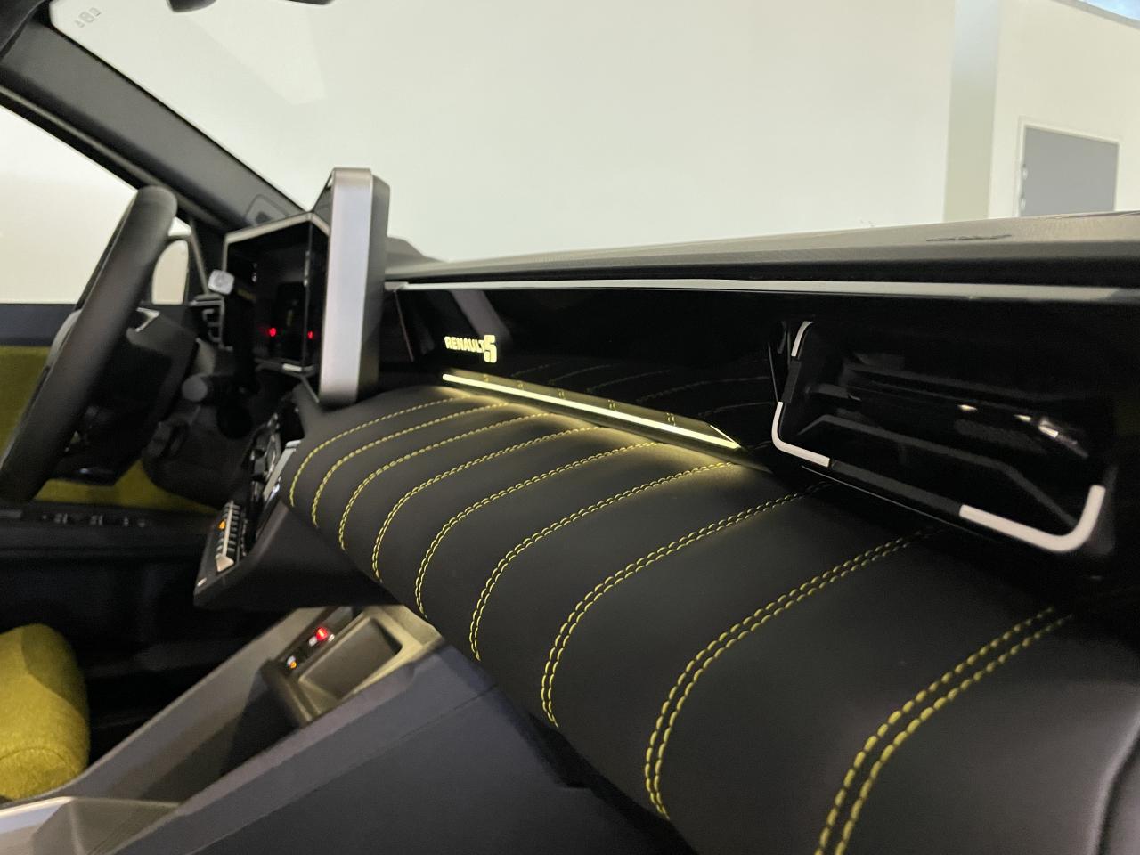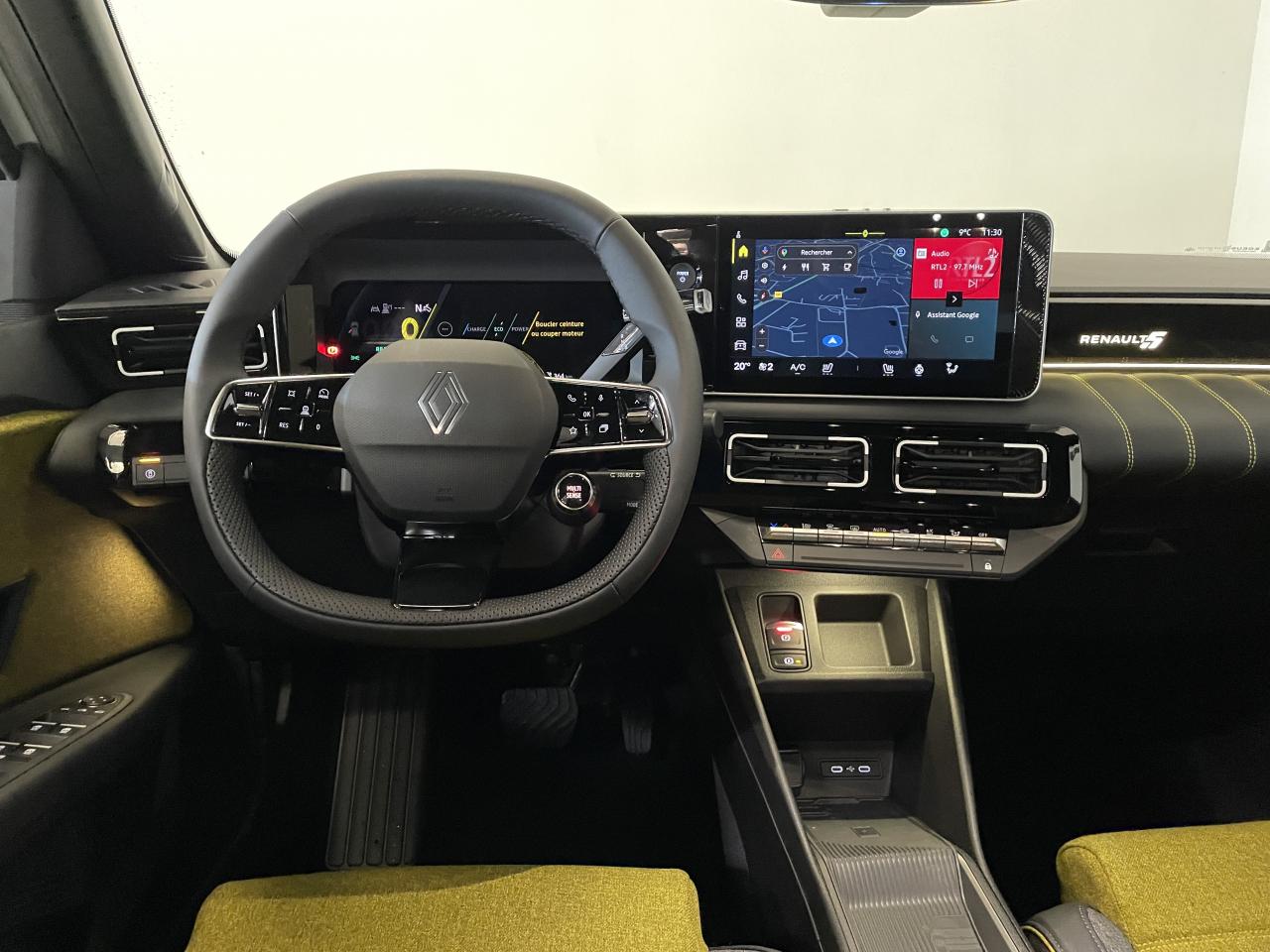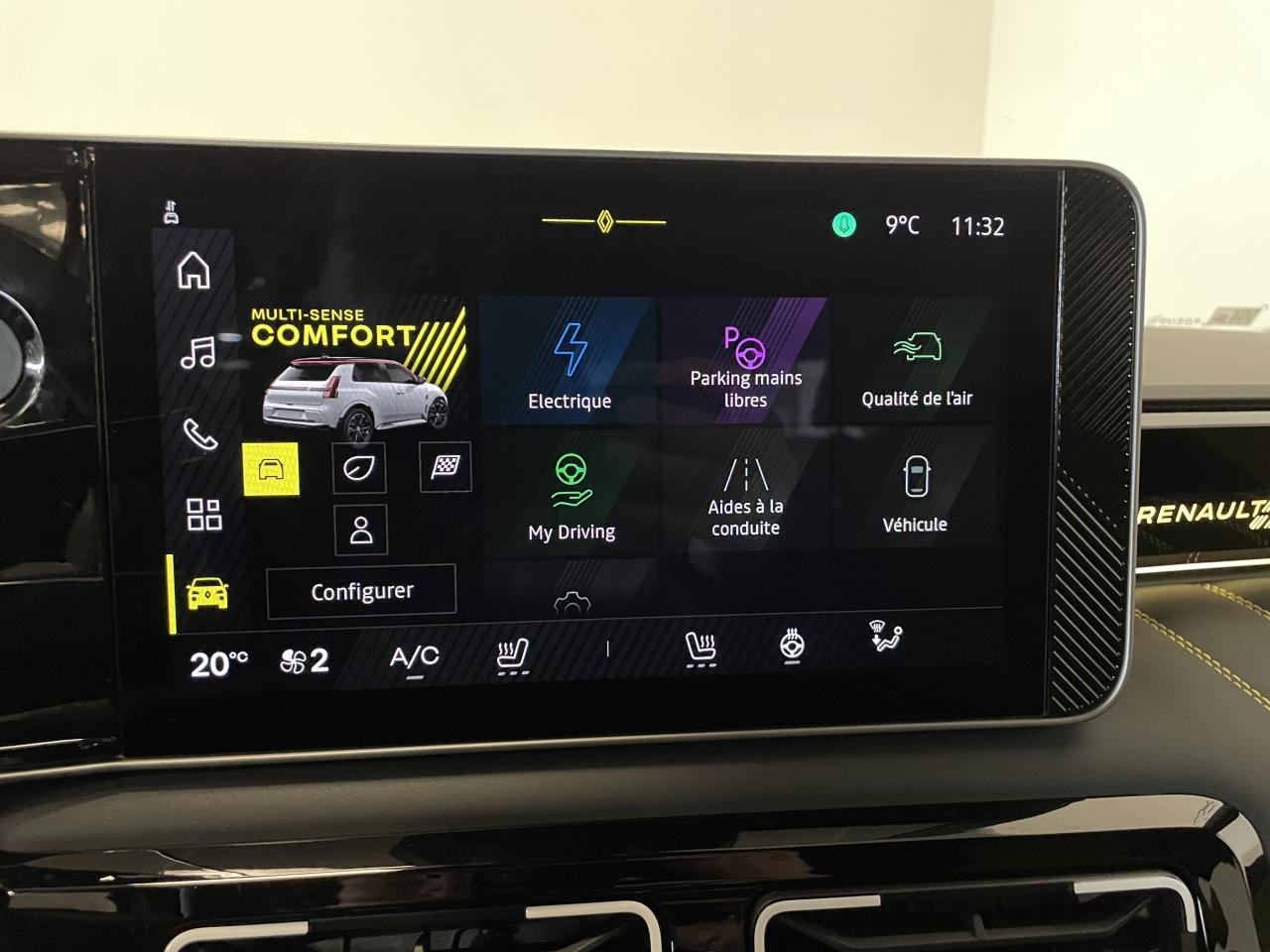 2 prises USB-C rétro-éclairéesABS avec aide au freinage d'urgenceAdaptateur Power to Object (charge bidirectionnelle V2L)Aide au centrage dans la voieAide au démarrage en côteAirbags frontaux avantAirbags latéraux avant / arrièreAirbags rideaux conducteur et passagerAlerte de survitesse avec reconnaissance des panneaux de signalisationAlerte distance de sécuritéAlerte franchissement de ligne et assistant maintien dans la voieAlerte sortie sécurisée des occupantsAntenne de toit « aileron de requin »Avertisseur d'angles mortsAvertisseur de sortie de stationnement en marche arrièreAvertisseur sonore pour piétonsBanquette arrière rabattable 40/60Boucliers avant et arrière, arches de roue et ceinture de caisse, en noir brillantCâble de recharge mode 3 (6,5 m)Caméra de reculCarte mains-libresChargeur de téléphone portable à inductionClimatisation automatique avantCombiné d'instruments digital de 31cm (12,3")Console centrale avec compartiment de rangement ferméConsole centrale haute avec accoudoir grainé textile refined noir et porte-gobeletContrôle électronique de stabilité (ESC)Décor extérieur de personnalisation portes avantDétecteur de luminositéDétection arrière avec correction trajectoire d’urgenceDétection avant avec correction trajectoire d’urgenceDirection assistée électrique avec assistance variableDispositif de gestion thermiqueFeux arrière full LEDFeux avant LED Adaptative VisionFixations Isofix pour siège passager avant et places latérales arrièreFonction appel d'urgenceFrein de parking électrique avec fonction Auto-HoldFreinage automatique d’urgence aux intersectionsFreinage automatique d’urgence urbain, inter-urbain (avec détection voitures, piétons, cyclistes)Freinage d’urgence en marche arrièreFreinage récupératif réglable par mode B (2 niveaux)Habillage textile refined sur planche de bord et textile chiné jaune sur les panneauxIndicateur de charge lumineux sur le capot en forme de 5Jantes alliage diamantées noir 18'' chronoJonc colorisé de vitres et ceinture de toitLimiteur de vitesseLiseuses arrière à LEDLiseuses pour les sièges avant à LEDLogos Renault avant chrome satin brosséMise à jour système inclus pendant 5 ansMulti-sense et ambiance lumineuse intérieure avantMy safety switchOpenR link 10,1” : système multimédia connecté avec Google intégré et le compagnon virtuel de conduite renoPack Advanced Driving AssistPack contrôle à distance (via l’application My Renault) inclus pendant 5 ansPack HiverPack ParkingPeinture bi-ton avec toit noirPeinture Noir EtoiléPoches aumônières au dos des sièges avantPompe à chaleurPréconditionnement de la température batterie en roulantPrise électrique 12 VProgrammation trajet électrique avec Google MapsProjecteurs full LED avant en forme de pupille, avec drapeau bleu-blanc-rougeRangement du câble de charge dans le coffreRéplication smartphone compatible Android Auto & Apple CarPlayRétroviseur intérieur électrochrome sans contourRétroviseurs extérieurs dégivrants et rabattables électriquementRétroviseurs extérieurs réglables électriquementSafety coachSellerie avec décor central de siège 5 jaune textile mixte 100% recyclé, textile chiné gris et jaune avec double surpiqûre jaune / textile refined biosourcé noirSéquence d’accueil graphique et sonoreSièges avant avec réglage manuelSièges avant réglables en hauteurSignature lumineuse avant uniqueSystème audio Arkamys avec 6 haut-parleursSystème d’insonorisation smart cocoonSystème d’optimisation de la température batterie (lors d’une charge rapide DC)Système de commutation automatique feux de route/feux de croisementSystème de désactivation de l'airbag passagerSystème de surveillance de l'attention du conducteurSystème de surveillance de la pression des pneumatiquesVitres arrière surteintéesVitres avant et arrière électriques avec fonction d'ouverture/fermeture par impulsion sur toutes les vitresVolant en textile refined grainé doux avec bouton multi-sense, 4 modes de conduite (comfort, sport, eco, perso)