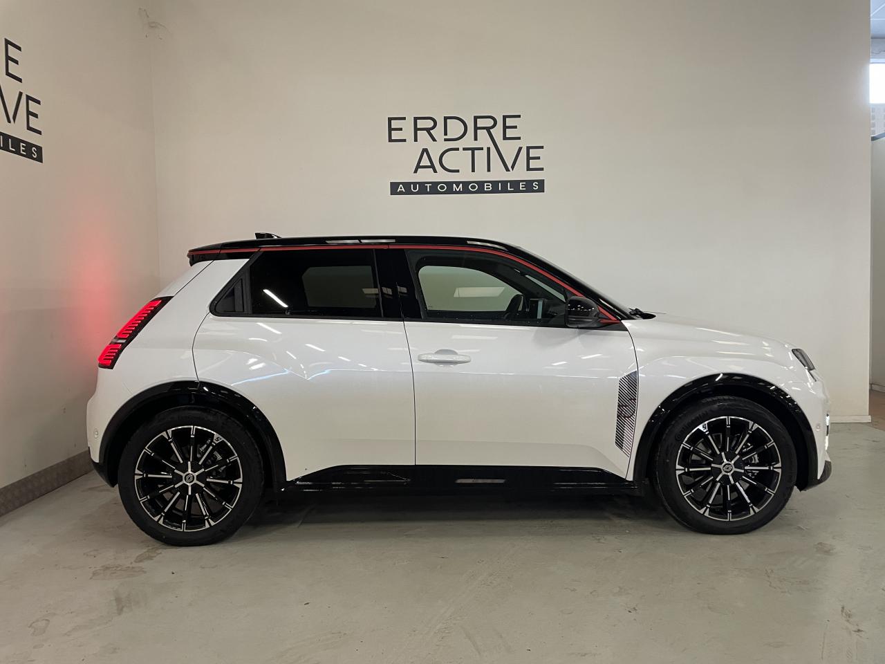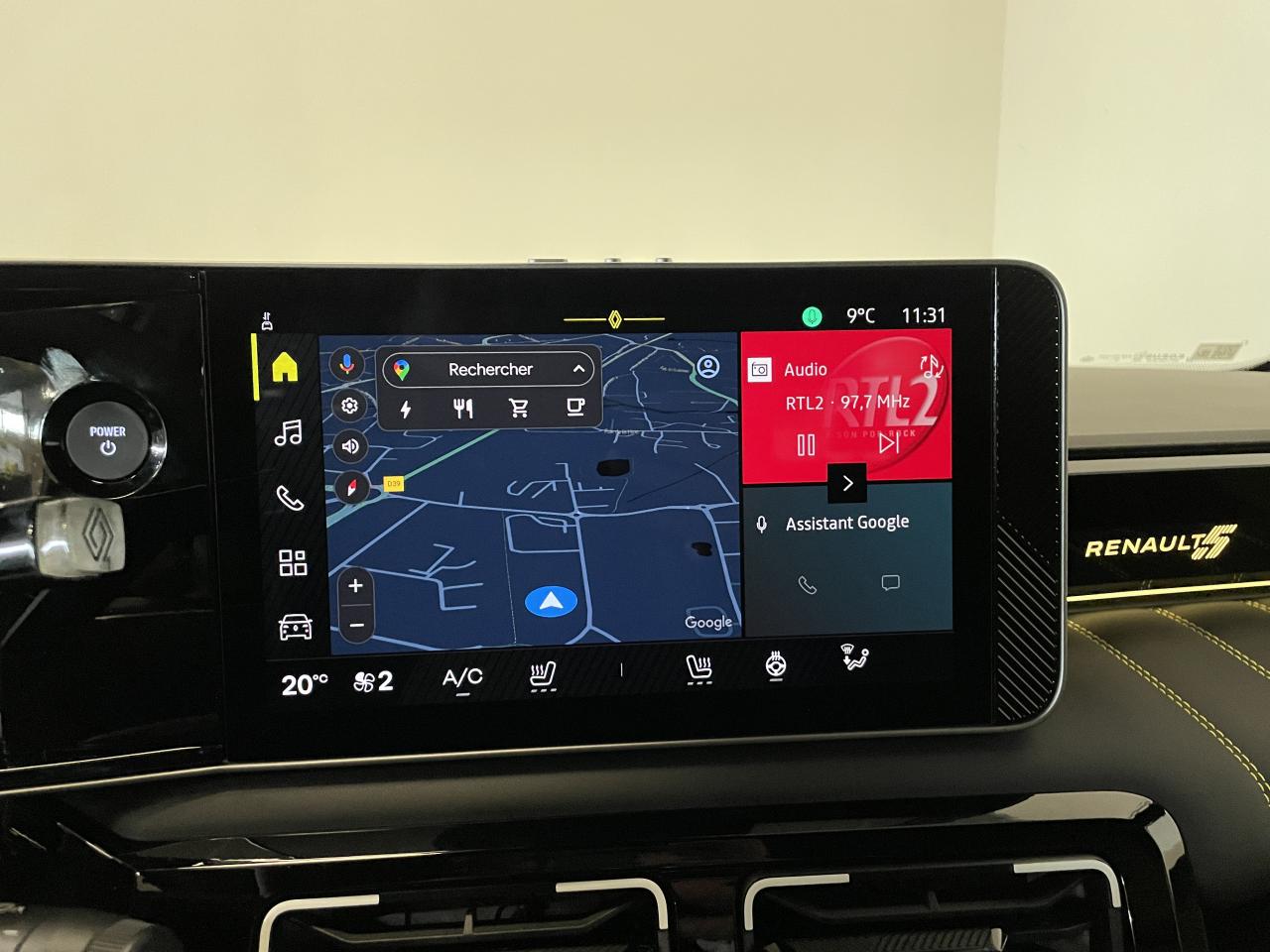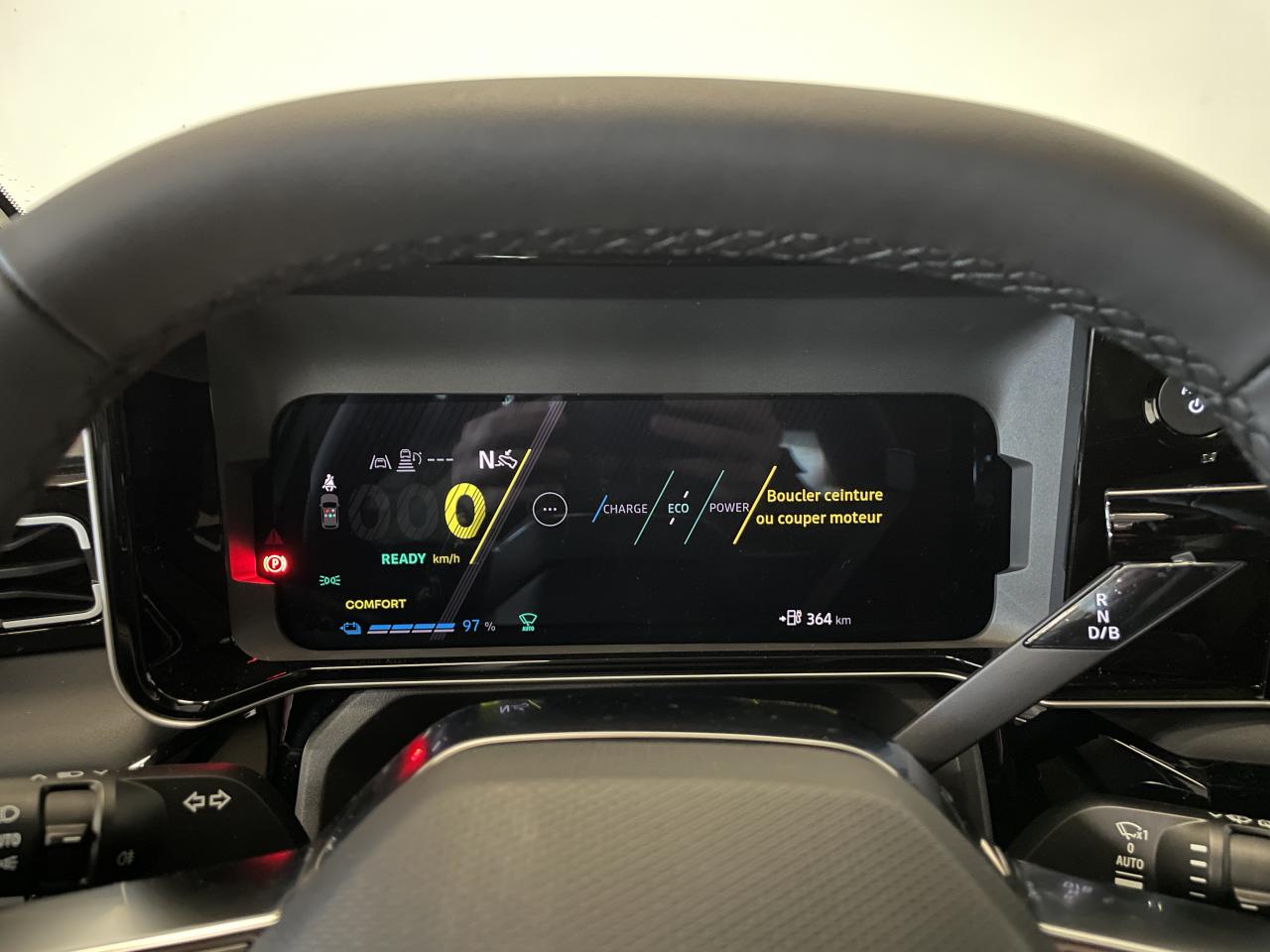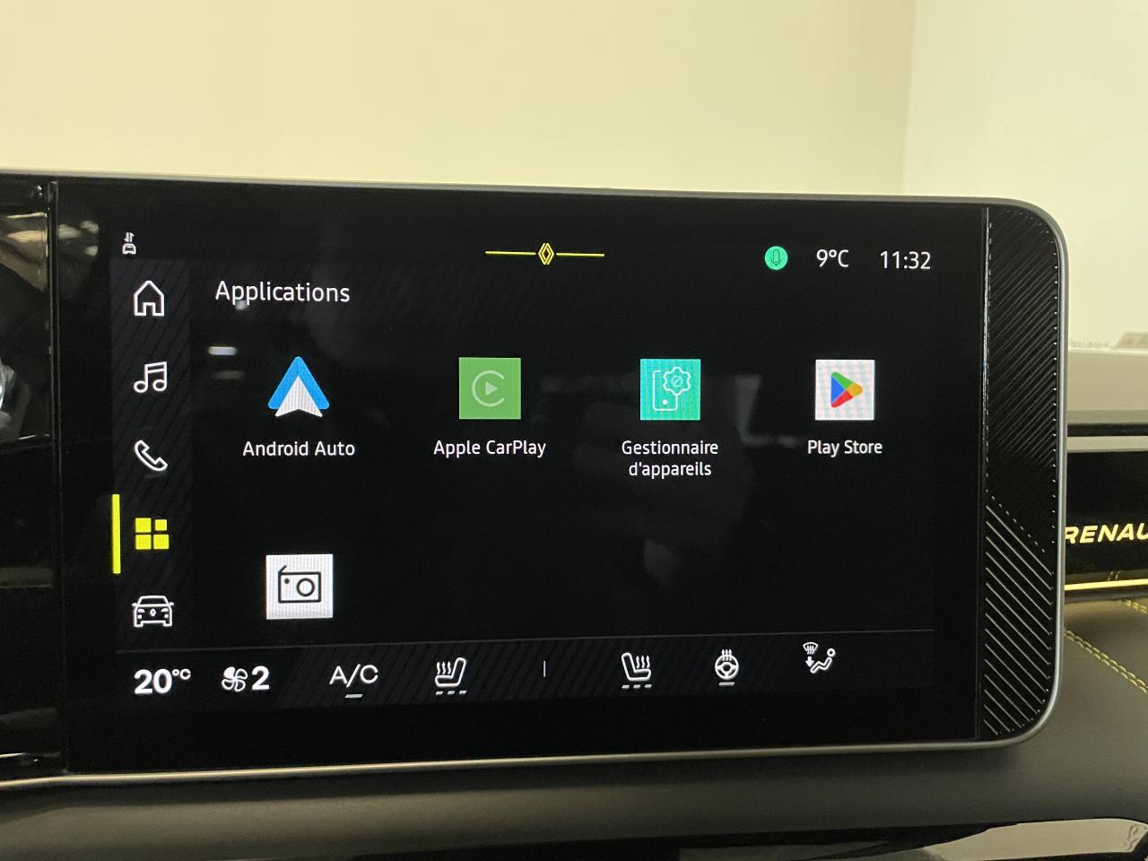 2 prises USB-C rétro-éclairéesABS avec aide au freinage d'urgenceAdaptateur Power to Object (charge bidirectionnelle V2L)Aide au centrage dans la voieAide au démarrage en côteAirbags frontaux avantAirbags latéraux avant / arrièreAirbags rideaux conducteur et passagerAlerte de survitesse avec reconnaissance des panneaux de signalisationAlerte distance de sécuritéAlerte franchissement de ligne et assistant maintien dans la voieAlerte sortie sécurisée des occupantsAntenne de toit « aileron de requin »Avertisseur d'angles mortsAvertisseur de sortie de stationnement en marche arrièreAvertisseur sonore pour piétonsBanquette arrière rabattable 40/60Boucliers avant et arrière, arches de roue et ceinture de caisse, en noir brillantCâble de recharge mode 3 (6,5 m)Caméra de reculCarte mains-libresChargeur de téléphone portable à inductionClimatisation automatique avantCombiné d'instruments digital de 31cm (12,3")Console centrale avec compartiment de rangement ferméConsole centrale haute avec accoudoir grainé textile refined noir et porte-gobeletContrôle électronique de stabilité (ESC)Décor extérieur de personnalisation portes avantDétecteur de luminositéDétection arrière avec correction trajectoire d’urgenceDétection avant avec correction trajectoire d’urgenceDirection assistée électrique avec assistance variableDispositif de gestion thermiqueFeux arrière full LEDFeux avant LED Adaptative VisionFixations Isofix pour siège passager avant et places latérales arrièreFonction appel d'urgenceFrein de parking électrique avec fonction Auto-HoldFreinage automatique d’urgence aux intersectionsFreinage automatique d’urgence urbain, inter-urbain (avec détection voitures, piétons, cyclistes)Freinage d’urgence en marche arrièreFreinage récupératif réglable par mode B (2 niveaux)Habillage textile refined sur planche de bord et textile chiné jaune sur les panneauxIndicateur de charge lumineux sur le capot en forme de 5Jantes alliage diamantées noir 18'' chronoJonc colorisé de vitres et ceinture de toitLimiteur de vitesseLiseuses arrière à LEDLiseuses pour les sièges avant à LEDLogos Renault avant chrome satin brosséMise à jour système inclus pendant 5 ansMulti-sense et ambiance lumineuse intérieure avantMy safety switchOpenR link 10,1” : système multimédia connecté avec Google intégré et le compagnon virtuel de conduite renoPack Advanced Driving AssistPack contrôle à distance (via l’application My Renault) inclus pendant 5 ansPack HiverPack ParkingPeinture bi-ton avec toit noirPeinture Noir EtoiléPoches aumônières au dos des sièges avantPompe à chaleurPréconditionnement de la température batterie en roulantPrise électrique 12 VProgrammation trajet électrique avec Google MapsProjecteurs full LED avant en forme de pupille, avec drapeau bleu-blanc-rougeRangement du câble de charge dans le coffreRéplication smartphone compatible Android Auto & Apple CarPlayRétroviseur intérieur électrochrome sans contourRétroviseurs extérieurs dégivrants et rabattables électriquementRétroviseurs extérieurs réglables électriquementSafety coachSellerie avec décor central de siège 5 jaune textile mixte 100% recyclé, textile chiné gris et jaune avec double surpiqûre jaune / textile refined biosourcé noirSéquence d’accueil graphique et sonoreSièges avant avec réglage manuelSièges avant réglables en hauteurSignature lumineuse avant uniqueSystème audio Arkamys avec 6 haut-parleursSystème d’insonorisation smart cocoonSystème d’optimisation de la température batterie (lors d’une charge rapide DC)Système de commutation automatique feux de route/feux de croisementSystème de désactivation de l'airbag passagerSystème de surveillance de l'attention du conducteurSystème de surveillance de la pression des pneumatiquesVitres arrière surteintéesVitres avant et arrière électriques avec fonction d'ouverture/fermeture par impulsion sur toutes les vitresVolant en textile refined grainé doux avec bouton multi-sense, 4 modes de conduite (comfort, sport, eco, perso)